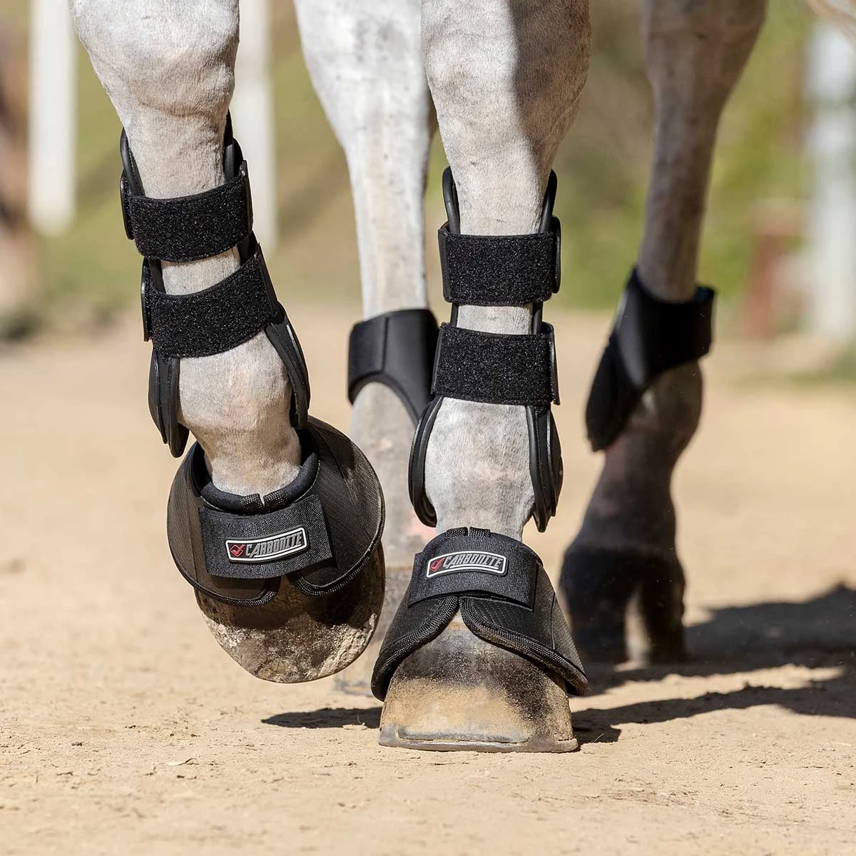 The LeMieux Carbonite Over-Reach Bell Boots feature a strong ballistic outer shell with etched carbon finish that mirror the angle of the pastern and contours the heels. Offers low level protection when in fast work without the risk of tripping. Its soft lining & collar prevents friction, with an inner no-turn knob to minimize rotation. The unique elasticated fillet closure allows boot to be tensioned around foot with a closer fit to prevent necessary movement. Double-lock Velcro ensures security. Sold in pairs.